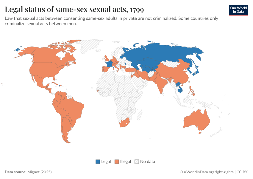 “Data Page: Legal status of same-sex sexual acts”, part of the following publication: Bastian Herre and Pablo Arriagada (2023) - “LGBT+ Rights”. Data adapted from Mignot. Retrieved from https://data-childlabor-ilounicef.owid.pages.dev:8789/20260304-094028/grapher/legal-status-of-same-sex-sexual-acts.html [online resource] (archived on March 4, 2026).How to cite this data