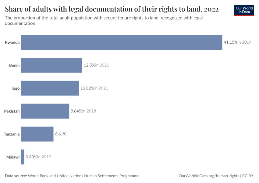 “Data Page: Share of adults with legal documentation of their rights to land”. Our World in Data (2026). Data adapted from World Bank and United Nations Human Settlements Programme. Retrieved from https://data-childlabor-ilounicef.owid.pages.dev:8789/20260304-094028/grapher/legally-recognized-rights-to-land.html [online resource] (archived on March 4, 2026).How to cite this data