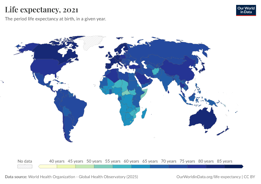 “Data Page: Life expectancy”. Our World in Data (2026). Data adapted from World Health Organization. Retrieved from https://data-childlabor-ilounicef.owid.pages.dev:8789/20260304-094028/grapher/life-expectancy-at-birth-who-gho.html [online resource] (archived on March 4, 2026).How to cite this data