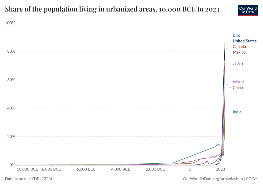 HYDE (2023) – with minor processing by Our World in Data. “Share of the population living in urbanized areas” [dataset]. PBL Netherlands Environmental Assessment Agency, “History Database of the Global Environment 3.3” [original data]. Retrieved April 14, 2026 from https://data-childlabor-ilounicef.owid.pages.dev:8789/20260325-171315/grapher/long-term-urban-population-region.html (archived on March 25, 2026).Download