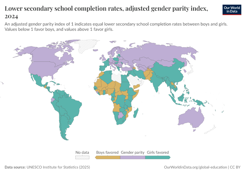 - A value of 1 means girls and boys complete lower secondary education at equal rates. Values below 1 suggest an advantage for boys; values above 1 suggest an advantage for girls.