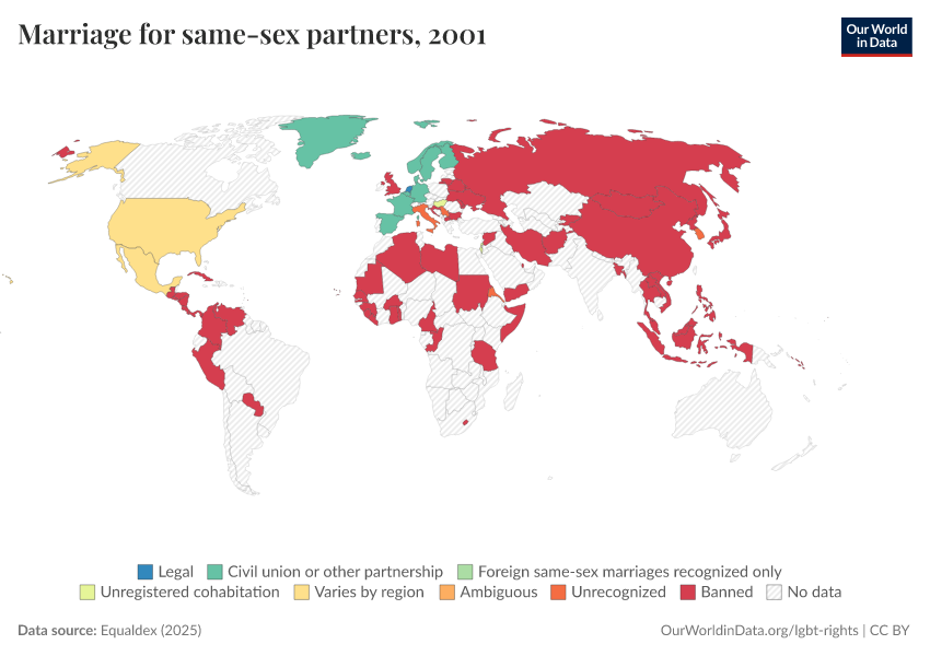“Data Page: Marriage for same-sex partners”, part of the following publication: Bastian Herre and Pablo Arriagada (2023) - “LGBT+ Rights”. Data adapted from Equaldex. Retrieved from https://data-childlabor-ilounicef.owid.pages.dev:8789/20260304-094028/grapher/marriage-same-sex-partners-equaldex.html [online resource] (archived on March 4, 2026).