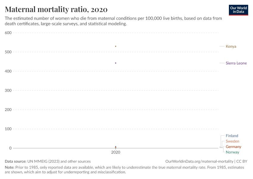 UN MMEIG (2023); WHO Mortality Database (2025); UN, World Population Prospects (2024); Gapminder (2010) – with major processing by Our World in Data. “Maternal mortality ratio” [dataset]. UN MMEIG (WHO, UNICEF, UNFPA, World Bank Group and UNDESA/ Population Division), “Trends in maternal mortality 2020”; WHO Mortality Database, “WHO Mortality Database”; United Nations, “World Population Prospects”; United Nations, “World Population Prospects - Interim Update”; Gapminder, “Maternal mortality ratio V1” [original data]. Retrieved April 14, 2026 from https://data-childlabor-ilounicef.owid.pages.dev:8789/20260402-173937/grapher/maternal-mortality.html (archived on April 2, 2026).