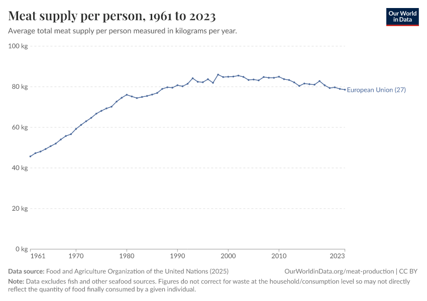 “Data Page: Yearly per capita supply of all meat”. Our World in Data (2026). Data adapted from Food and Agriculture Organization of the United Nations. Retrieved from https://data-childlabor-ilounicef.owid.pages.dev:8789/20260402-173937/grapher/meat-supply-per-person.html [online resource] (archived on April 2, 2026).