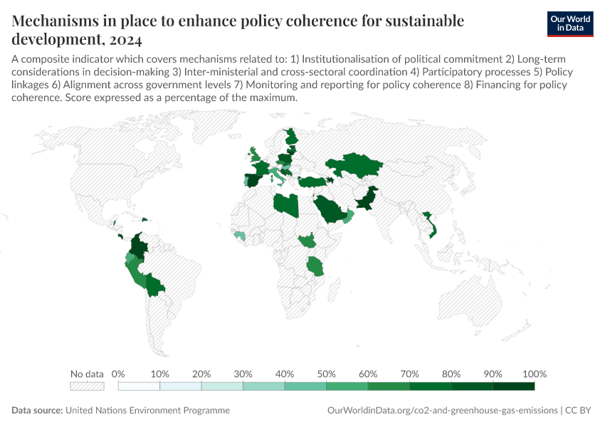 United Nations Environment Programme – processed by Our World in Data. “Mechanisms in place to enhance policy coherence for sustainable development” [dataset]. United Nations Environment Programme, “Data from multiple sources” [original data]. Retrieved April 14, 2026 from https://data-childlabor-ilounicef.owid.pages.dev:8789/20260304-094028/grapher/mechanisms-to-enhance-policy-for-sustainable-development.html (archived on March 4, 2026).Download