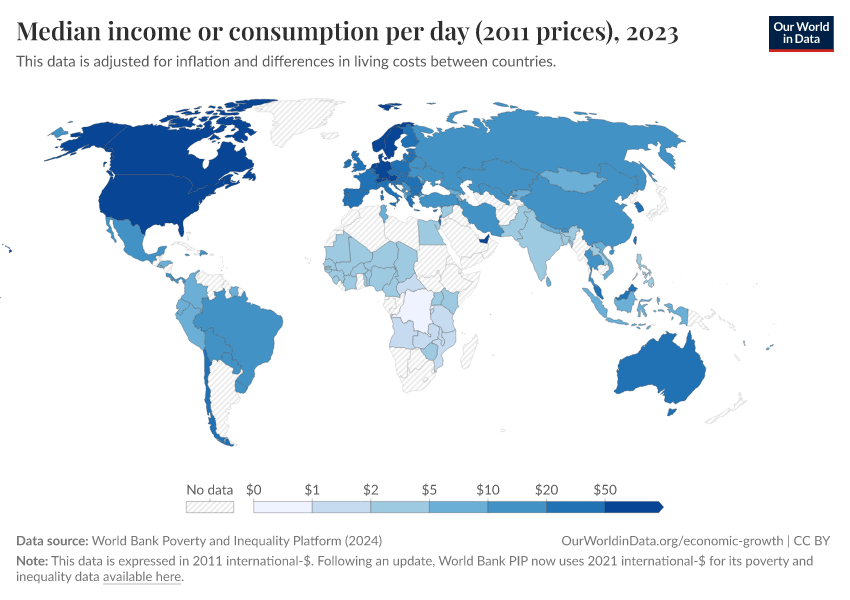 World Bank Poverty and Inequality Platform (2024) – with major processing by Our World in Data. “Median income or consumption per day (2011 prices) – World Bank” [dataset]. World Bank Poverty and Inequality Platform, “World Bank Poverty and Inequality Platform (PIP) 20240627_2017, 20240627_2011” [original data]. Retrieved April 14, 2026 from https://data-childlabor-ilounicef.owid.pages.dev:8789/20260304-094028/grapher/median-income-or-consumption-per-day-2011-prices.html (archived on March 4, 2026).