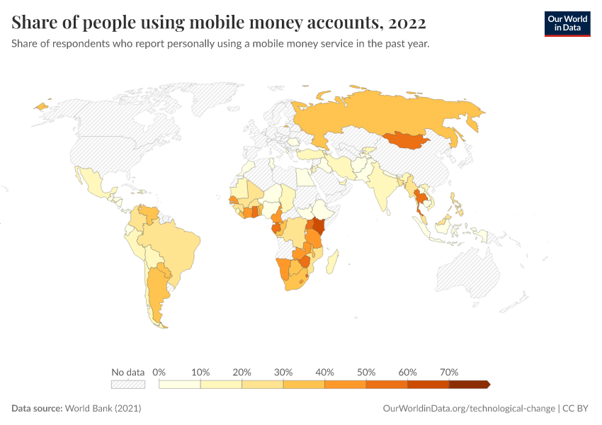 World Bank (2021) – with minor processing by Our World in Data. “Share of people using mobile money accounts” [dataset]. World Bank, “The Global Findex Database” [original data]. Retrieved April 14, 2026 from https://data-childlabor-ilounicef.owid.pages.dev:8789/20260304-094028/grapher/mobile-money-account-usage.html (archived on March 4, 2026).Download