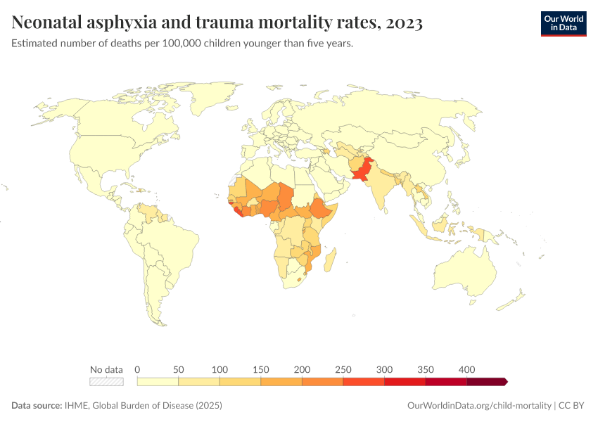 IHME, Global Burden of Disease (2025) – with major processing by Our World in Data. “Neonatal asphyxia and trauma mortality rates – IHME” [dataset]. IHME, Global Burden of Disease, “Global Burden of Disease - Deaths” [original data]. Retrieved April 14, 2026 from https://data-childlabor-ilounicef.owid.pages.dev:8789/20260323-161325/grapher/mortality-neonatal-asphyxia-and-trauma.html (archived on March 23, 2026).