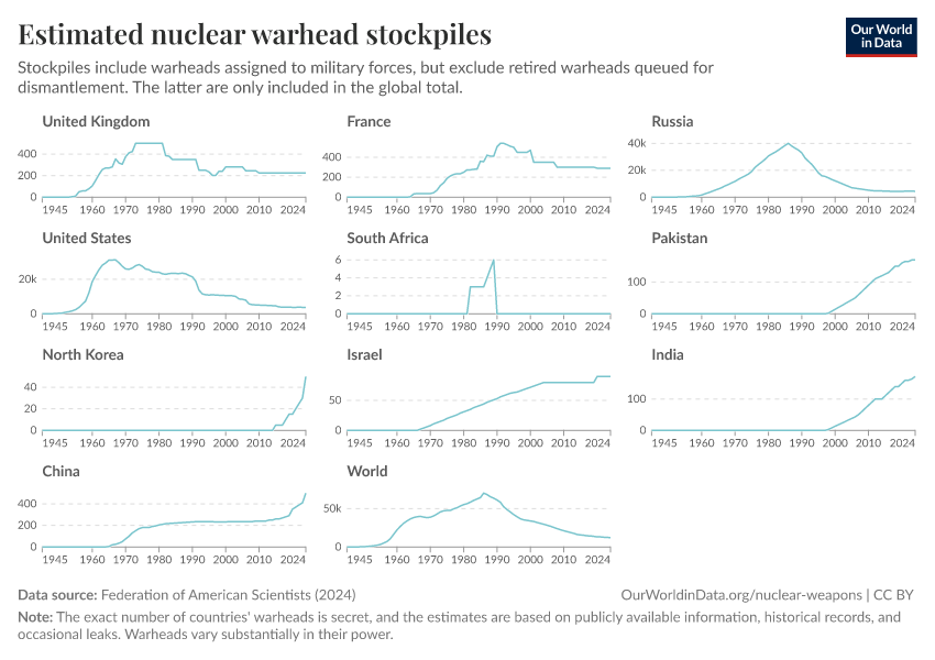 Federation of American Scientists (2024) – with minor processing by Our World in Data. “Estimated nuclear warhead stockpiles” [dataset]. Federation of American Scientists, “Estimated Global Nuclear Warhead Inventories” [original data]. Retrieved April 14, 2026 from https://data-childlabor-ilounicef.owid.pages.dev:8789/20260304-094028/grapher/nuclear-warhead-stockpiles-lines.html (archived on March 4, 2026).Download