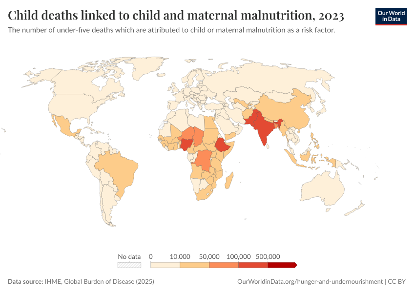 IHME, Global Burden of Disease (2025) – with major processing by Our World in Data. “Child deaths linked to child and maternal malnutrition – IHME” [dataset]. IHME, Global Burden of Disease, “Global Burden of Disease - Risk Factors - Deaths” [original data]. Retrieved April 17, 2026 from https://data-childlabor-ilounicef.owid.pages.dev:8789/20260319-180137/grapher/number-child-deaths-malnutrition.html (archived on March 19, 2026).