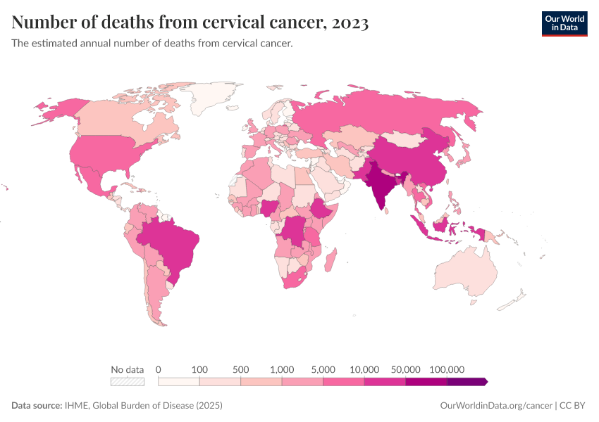 “Data Page: Number of deaths from cervical cancer”, part of the following publication: Esteban Ortiz-Ospina and Max Roser (2016) - “Global Health”. Data adapted from IHME, Global Burden of Disease. Retrieved from https://data-childlabor-ilounicef.owid.pages.dev:8789/20260323-160356/grapher/number-of-deaths-from-cervical-cancer.html [online resource] (archived on March 23, 2026).How to cite this data
