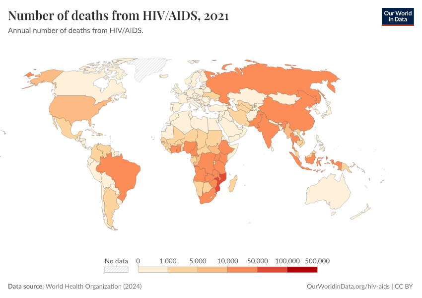 “Data Page: Number of deaths from HIV/AIDS”, part of the following publication: Esteban Ortiz-Ospina and Max Roser (2016) - “Global Health”. Data adapted from World Health Organization. Retrieved from https://data-childlabor-ilounicef.owid.pages.dev:8789/20260325-171315/grapher/number-of-deaths-from-hivaids-who.html [online resource] (archived on March 25, 2026).How to cite this data