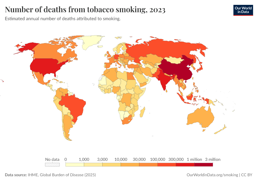 “Data Page: Number of deaths from tobacco smoking”, part of the following publication: Esteban Ortiz-Ospina and Max Roser (2016) - “Global Health”. Data adapted from IHME, Global Burden of Disease. Retrieved from https://data-childlabor-ilounicef.owid.pages.dev:8789/20260406-174056/grapher/number-of-deaths-from-tobacco-smoking.html [online resource] (archived on April 6, 2026).How to cite this data