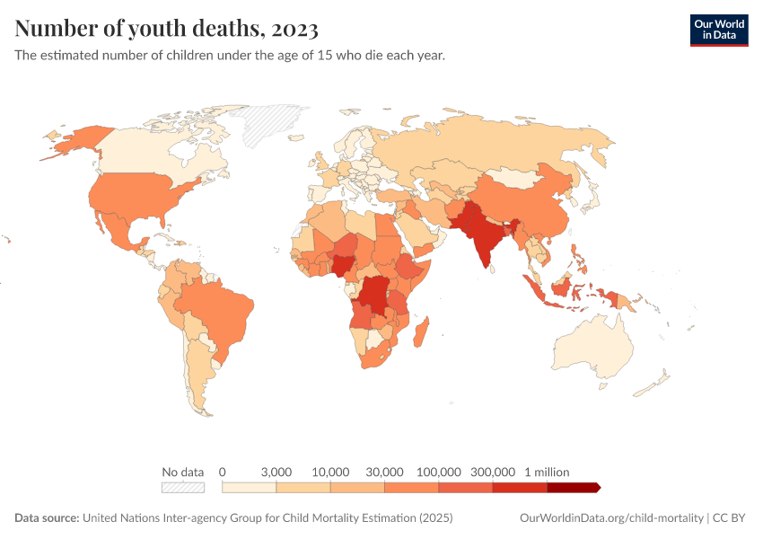 United Nations Inter-agency Group for Child Mortality Estimation (2025) – with minor processing by Our World in Data. “Under-fifteen deaths” [dataset]. United Nations Inter-agency Group for Child Mortality Estimation, “United Nations Inter-agency Group for Child Mortality Estimation”; UN Inter-agency Group for Child Mortality Estimation, “Child Mortality Estimates 2018”; Various sources, “Population” [original data]. Retrieved April 14, 2026 from https://data-childlabor-ilounicef.owid.pages.dev:8789/20260402-164039/grapher/number-of-youth-deaths.html (archived on April 2, 2026).