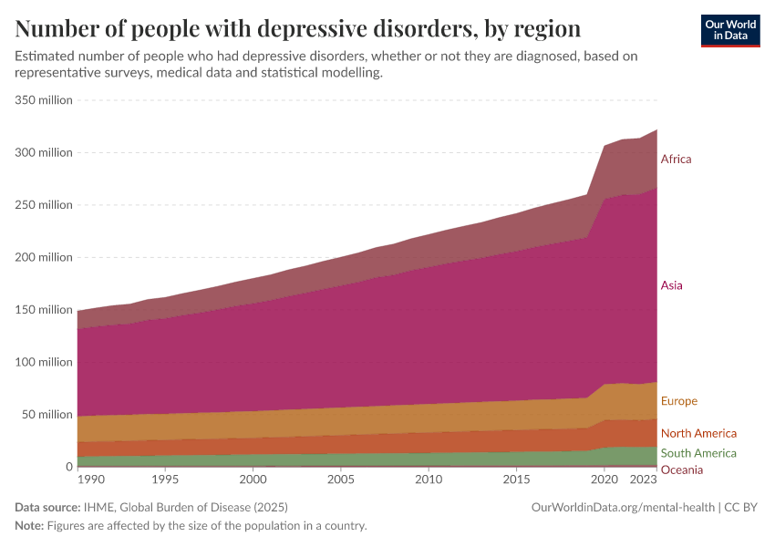 “Data Page: Number of people with depressive disorders, by region”, part of the following publication: Saloni Dattani, Lucas Rodés-Guirao, Hannah Ritchie, and Max Roser (2023) - “Mental Health”. Data adapted from IHME, Global Burden of Disease. Retrieved from https://data-childlabor-ilounicef.owid.pages.dev:8789/20260319-181852/grapher/number-suffering-from-depression-by-region.html [online resource] (archived on March 19, 2026).How to cite this data