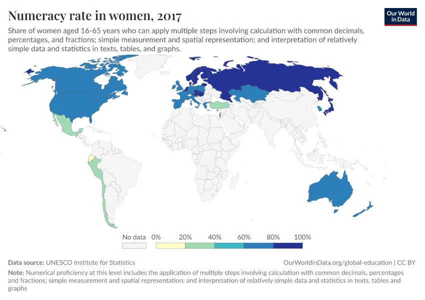 “Data Page: Numeracy rate in women”. Our World in Data (2026). Data adapted from UNESCO Institute for Statistics. Retrieved from https://data-childlabor-ilounicef.owid.pages.dev:8789/20260304-094028/grapher/numeracy-rate-in-adult-women-sdg.html [online resource] (archived on March 4, 2026).How to cite this data
