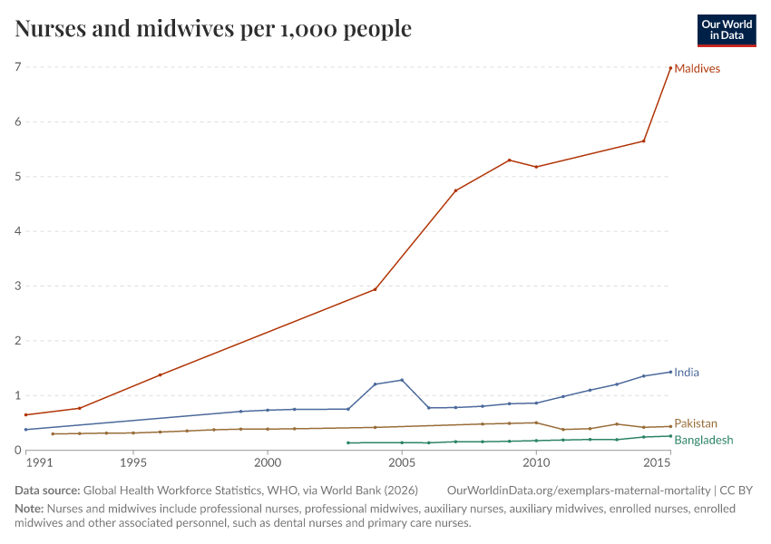 “Data Page: Nurses and midwives per 1,000 people”. Our World in Data (2026). Data adapted from Global Health Workforce Statistics, WHO, via World Bank. Retrieved from https://data-childlabor-ilounicef.owid.pages.dev:8789/20260304-094028/grapher/nurses-and-midwives-per-1000-people.html [online resource] (archived on March 4, 2026).How to cite this data