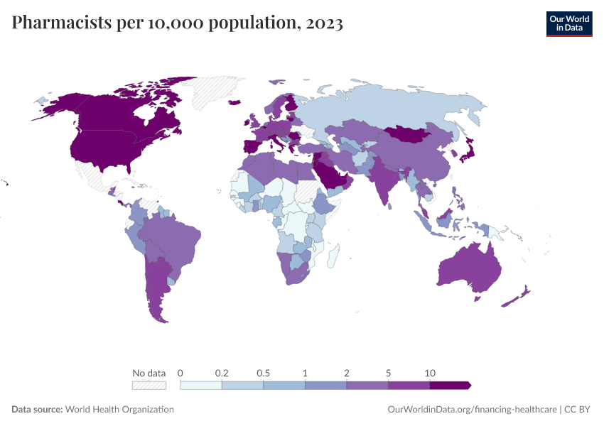 “Data Page: Pharmacists per 10,000 population”. Our World in Data (2026). Data adapted from World Health Organization. Retrieved from https://data-childlabor-ilounicef.owid.pages.dev:8789/20260304-094028/grapher/pharmaceutical-personnel-per-1000.html [online resource] (archived on March 4, 2026).How to cite this data