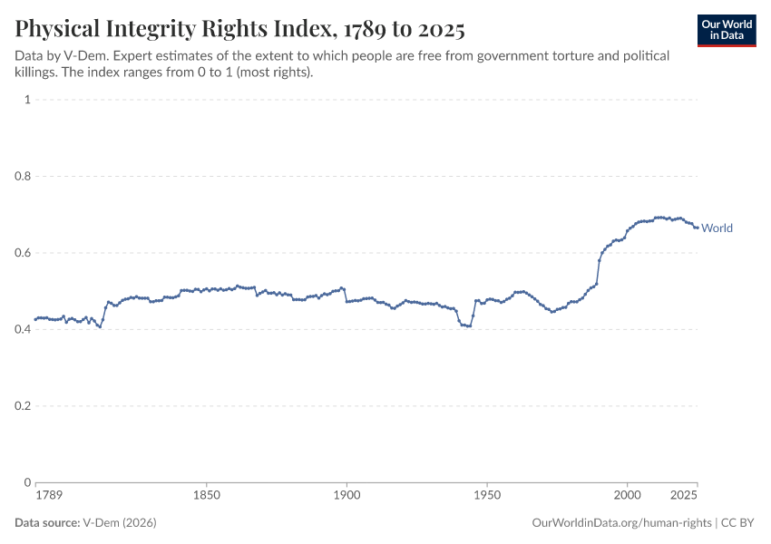 V-Dem (2026) – processed by Our World in Data. “Physical violence index – V-Dem” [dataset]. V-Dem, “Democracy report v16” [original data]. Retrieved April 14, 2026 from https://data-childlabor-ilounicef.owid.pages.dev:8789/20260402-164039/grapher/physical-integrity-rights-index-vdem.html (archived on April 2, 2026).Download
