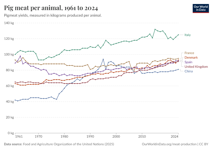 Food and Agriculture Organization of the United Nations (2025) – with major processing by Our World in Data. “Pig meat yield per animal – UN FAO” [dataset]. Food and Agriculture Organization of the United Nations, “Production: Crops and livestock products” [original data]. Retrieved April 14, 2026 from https://data-childlabor-ilounicef.owid.pages.dev:8789/20260304-094028/grapher/pig-yields-meat-per-animal-in-hectograms-100-grams.html (archived on March 4, 2026).