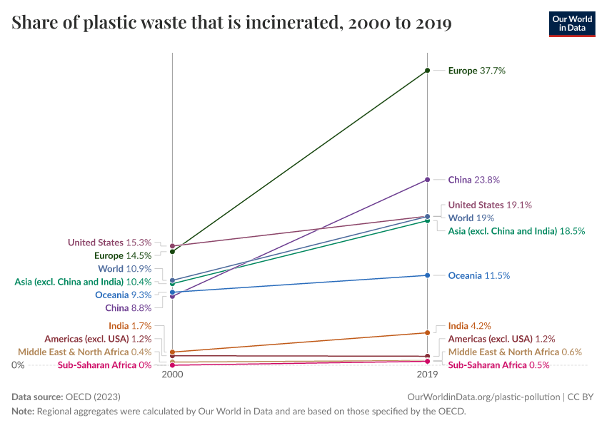 OECD (2023) – processed by Our World in Data. “Share of plastic waste that is incinerated” [dataset]. OECD, “Global Plastics Outlook - Plastics waste by region and end-of-life fate” [original data]. Retrieved April 14, 2026 from https://data-childlabor-ilounicef.owid.pages.dev:8789/20260304-094028/grapher/plastic-waste-incinerated.html (archived on March 4, 2026).Download