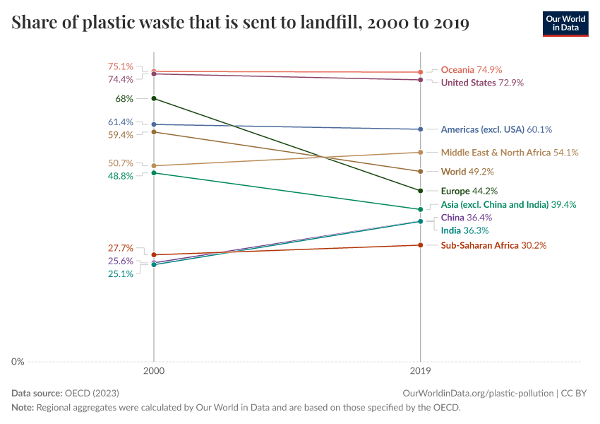 “Data Page: Share of plastic waste that is sent to landfill”, part of the following publication: Hannah Ritchie, Veronika Samborska, and Max Roser (2023) - “Plastic Pollution”. Data adapted from OECD. Retrieved from https://data-childlabor-ilounicef.owid.pages.dev:8789/20260304-094028/grapher/plastic-waste-landfill.html [online resource] (archived on March 4, 2026).How to cite this data