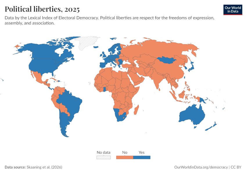“Data Page: Political liberties”, part of the following publication: Bastian Herre, Lucas Rodés-Guirao, and Esteban Ortiz-Ospina (2013) - “Democracy”. Data adapted from Skaaning et al.. Retrieved from https://data-childlabor-ilounicef.owid.pages.dev:8789/20260402-174958/grapher/political-liberties-lexical.html [online resource] (archived on April 2, 2026).How to cite this data