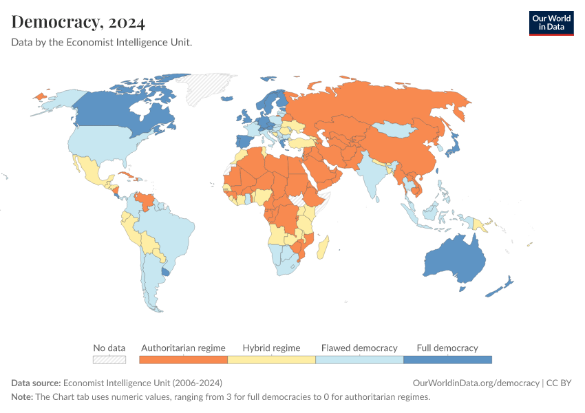 Economist Intelligence Unit (2006-2024) – processed by Our World in Data. “Democracy” [dataset]. Economist Intelligence Unit, “Democracy Index 2021: The China challenge”; Economist Intelligence Unit, “Democracy Index 2022: Frontline democracy and the battle for Ukraine”; Economist Intelligence Unit, “Democracy Index 2023: Age of Conflict”; Economist Intelligence Unit, “Democracy Index 2024: What's wrong with representative democracy?”; Gapminder, “Democracy Index v4” [original data]. Retrieved April 14, 2026 from https://data-childlabor-ilounicef.owid.pages.dev:8789/20260304-094028/grapher/political-regime-eiu.html (archived on March 4, 2026).Download