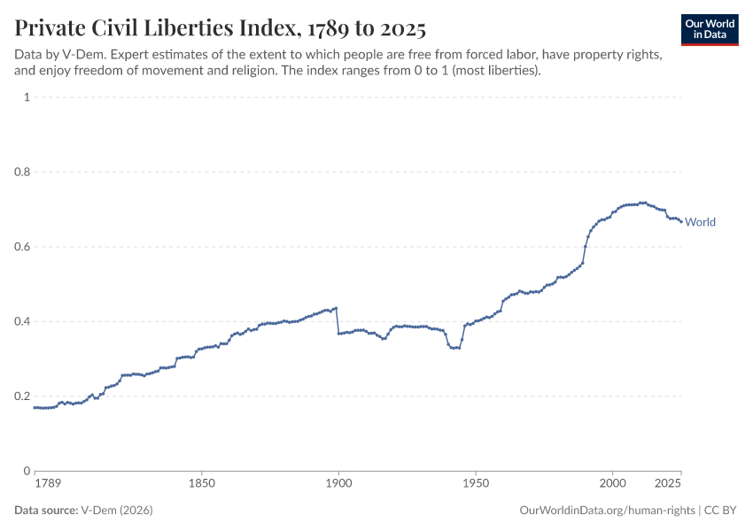 V-Dem (2026) – processed by Our World in Data. “Private civil liberties index – V-Dem” [dataset]. V-Dem, “Democracy report v16” [original data]. Retrieved April 14, 2026 from https://data-childlabor-ilounicef.owid.pages.dev:8789/20260402-164039/grapher/private-civil-liberties-index.html (archived on April 2, 2026).