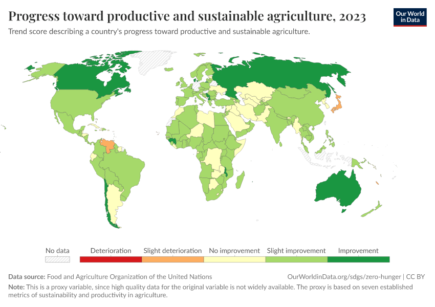 “Data Page: Progress toward productive and sustainable agriculture”. Our World in Data (2026). Data adapted from Food and Agriculture Organization of the United Nations. Retrieved from https://data-childlabor-ilounicef.owid.pages.dev:8789/20260304-094028/grapher/progress-toward-productive-and-sustainable-agriculture.html [online resource] (archived on March 4, 2026).How to cite this data