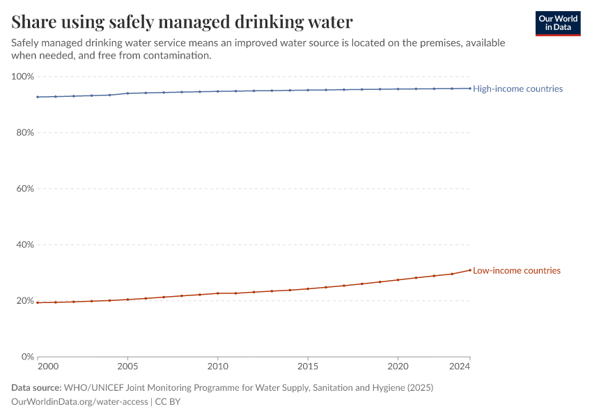 WHO/UNICEF Joint Monitoring Programme for Water Supply, Sanitation and Hygiene (2025) – processed by Our World in Data. “Share using safely managed drinking water” [dataset]. World Health Organization/UNICEF Joint Monitoring Programme for Water Supply, Sanitation and Hygiene, “WHO/UNICEF Joint Monitoring Programme for Water Supply, Sanitation and Hygiene (JMP) 2000-2024 report” [original data]. Retrieved April 14, 2026 from https://data-childlabor-ilounicef.owid.pages.dev:8789/20260304-094028/grapher/proportion-using-safely-managed-drinking-water.html (archived on March 4, 2026).Download