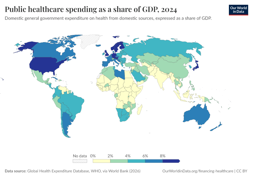 “Data Page: Public healthcare spending as a share of GDP”. Our World in Data (2026). Data adapted from Global Health Expenditure Database, WHO, via World Bank. Retrieved from https://data-childlabor-ilounicef.owid.pages.dev:8789/20260304-094028/grapher/public-healthcare-spending-share-gdp.html [online resource] (archived on March 4, 2026).How to cite this data