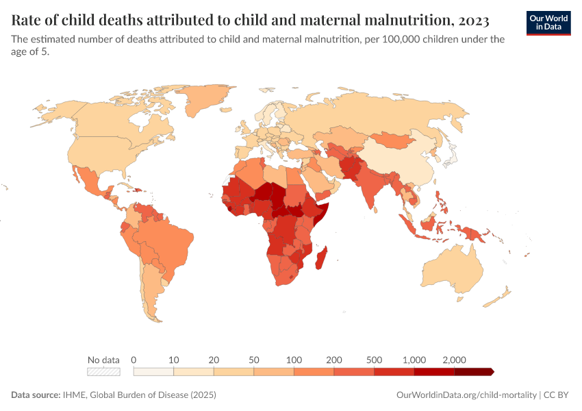 IHME, Global Burden of Disease (2025) – with major processing by Our World in Data. “Rate of child deaths attributed to child and maternal malnutrition – IHME” [dataset]. IHME, Global Burden of Disease, “Global Burden of Disease - Risk Factors - Deaths” [original data]. Retrieved April 14, 2026 from https://data-childlabor-ilounicef.owid.pages.dev:8789/20260319-180505/grapher/rate-of-child-deaths-attributed-to-child-and-maternal-malnutrition.html (archived on March 19, 2026).