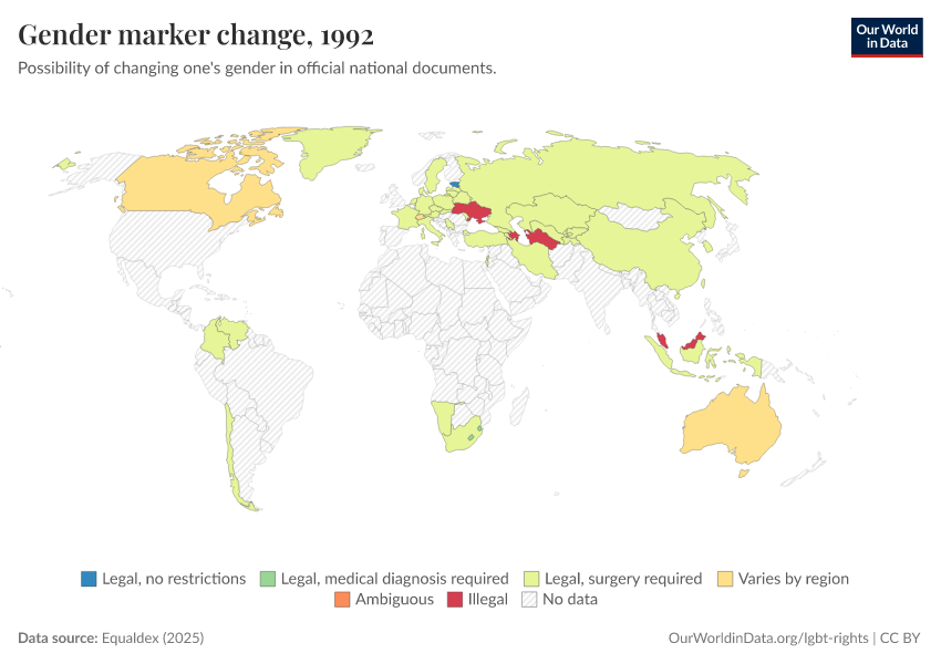 “Data Page: Gender marker change”, part of the following publication: Bastian Herre and Pablo Arriagada (2023) - “LGBT+ Rights”. Data adapted from Equaldex. Retrieved from https://data-childlabor-ilounicef.owid.pages.dev:8789/20260304-094028/grapher/right-to-change-legal-gender-equaldex.html [online resource] (archived on March 4, 2026).How to cite this data