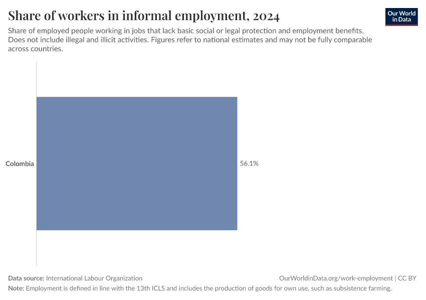 “Data Page: Share of workers in informal employment”. Our World in Data (2026). Data adapted from International Labour Organization. Retrieved from https://data-childlabor-ilounicef.owid.pages.dev:8789/20260402-163007/grapher/share-in-informal-employment.html [online resource] (archived on April 2, 2026).How to cite this data