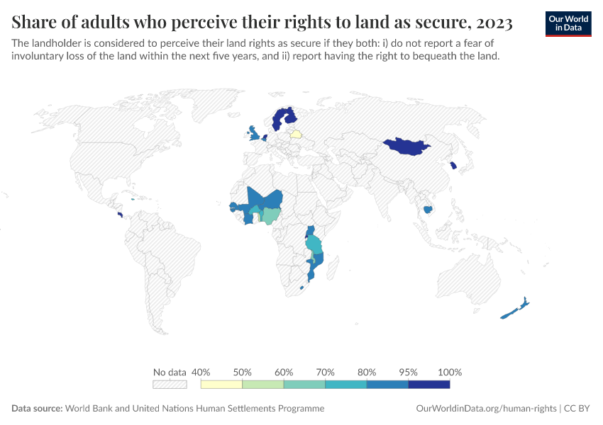 “Data Page: Share of adults who perceive their rights to land as secure”. Our World in Data (2026). Data adapted from World Bank and United Nations Human Settlements Programme. Retrieved from https://data-childlabor-ilounicef.owid.pages.dev:8789/20260304-094028/grapher/share-of-adults-who-perceive-their-rights-to-land-as-secure.html [online resource] (archived on March 4, 2026).How to cite this data