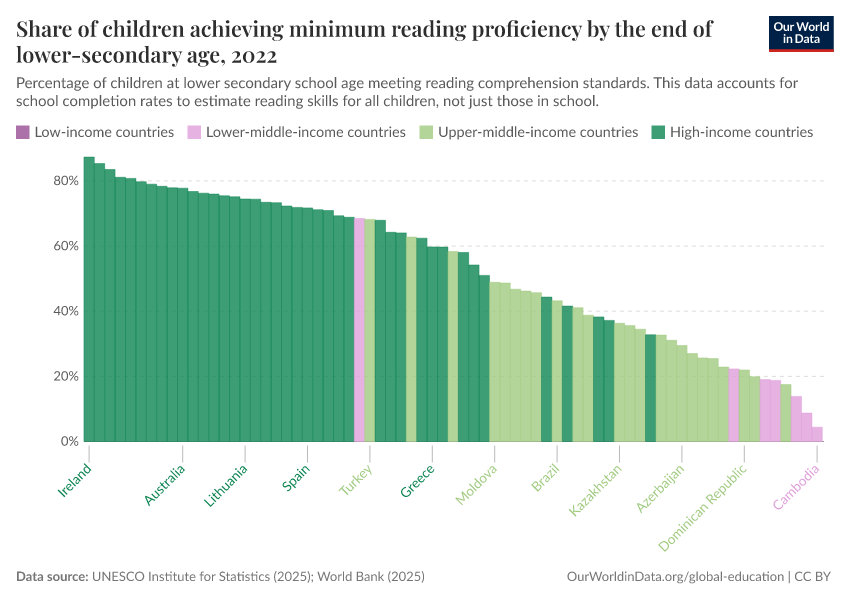 “Data Page: Share of children achieving minimum reading proficiency by the end of lower secondary age”, part of the following publication: Hannah Ritchie, Veronika Samborska, Esteban Ortiz-Ospina, and Max Roser (2023) - “Global Education”. Data adapted from UNESCO Institute for Statistics. Retrieved from https://data-childlabor-ilounicef.owid.pages.dev:8789/20260304-094028/grapher/share-of-children-reaching-sufficient-reading-comprehension-by-the-end-of-lower-secondary-age.html [online resource] (archived on March 4, 2026).How to cite this data