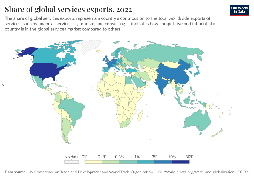 “Data Page: Share of global services exports”. Our World in Data (2026). Data adapted from UN Conference on Trade and Development and World Trade Organization. Retrieved from https://data-childlabor-ilounicef.owid.pages.dev:8789/20260304-094028/grapher/share-of-global-services-exports.html [online resource] (archived on March 4, 2026).How to cite this data