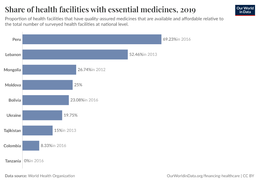 “Data Page: Share of health facilities with essential medicines”. Our World in Data (2026). Data adapted from World Health Organization. Retrieved from https://data-childlabor-ilounicef.owid.pages.dev:8789/20260304-094028/grapher/share-of-health-facilities-with-essential-medicines.html [online resource] (archived on March 4, 2026).How to cite this data