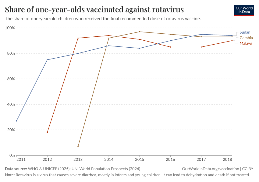 “Data Page: Share of one-year-olds vaccinated against rotavirus”, part of the following publication: Fiona Spooner, Saloni Dattani, Samantha Vanderslott, and Max Roser (2022) - “Vaccination”. Data adapted from WHO & UNICEF, United Nations. Retrieved from https://data-childlabor-ilounicef.owid.pages.dev:8789/20260402-164039/grapher/share-of-one-year-olds-who-received-the-rotavirus-vaccine.html [online resource] (archived on April 2, 2026).How to cite this data