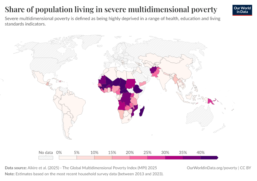 “Data Page: Share of population living in severe multidimensional poverty”, part of the following publication: Joe Hasell, Bertha Rohenkohl, Pablo Arriagada, Esteban Ortiz-Ospina, and Max Roser (2022) - “Poverty”. Data adapted from Alkire et al.. Retrieved from https://data-childlabor-ilounicef.owid.pages.dev:8789/20260325-171315/grapher/share-of-population-in-severe-multidimensional-poverty.html [online resource] (archived on March 25, 2026).How to cite this data