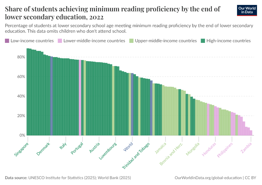 “Data Page: Share of students achieving minimum reading proficiency by the end of lower secondary education”, part of the following publication: Hannah Ritchie, Veronika Samborska, Esteban Ortiz-Ospina, and Max Roser (2023) - “Global Education”. Data adapted from UNESCO Institute for Statistics. Retrieved from https://data-childlabor-ilounicef.owid.pages.dev:8789/20260304-094028/grapher/share-of-students-at-end-of-lower-secondary-education-with-minimum-reading-proficiency.html [online resource] (archived on March 4, 2026).How to cite this data