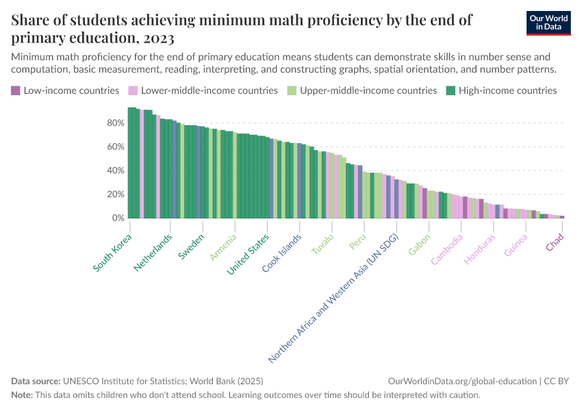 “Data Page: Share of students achieving minimum math proficiency by the end of primary education”. Our World in Data (2026). Data adapted from UNESCO Institute for Statistics. Retrieved from https://data-childlabor-ilounicef.owid.pages.dev:8789/20260304-094028/grapher/share-of-students-at-end-of-primary-education-achieving-minimum-math-proficiency.html [online resource] (archived on March 4, 2026).How to cite this data