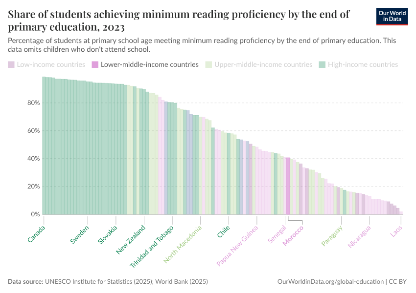 UNESCO Institute for Statistics (2025) – with minor processing by Our World in Data. “Share of students achieving minimum reading proficiency by the end of primary education” [dataset]. UNESCO Institute for Statistics, “UNESCO Institute for Statistics (UIS) - Education” [original data]. Retrieved April 14, 2026 from https://data-childlabor-ilounicef.owid.pages.dev:8789/20260304-094028/grapher/share-of-students-at-end-of-primary-education-achieving-minimum-reading-proficiency.html (archived on March 4, 2026).Download