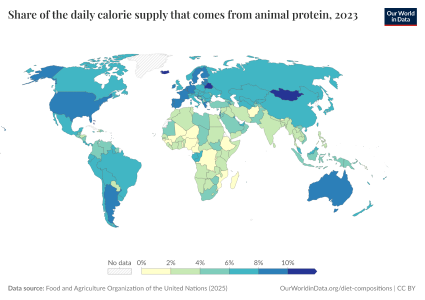 “Data Page: Share of the daily calorie supply that comes from animal protein”, part of the following publication: Hannah Ritchie, Pablo Rosado, and Max Roser (2023) - “Agricultural Production”. Data adapted from Food and Agriculture Organization of the United Nations. Retrieved from https://data-childlabor-ilounicef.owid.pages.dev:8789/20260402-173937/grapher/share-of-the-daily-calorie-supply-that-comes-from-animal-protein.html [online resource] (archived on April 2, 2026).How to cite this data