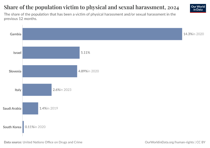 “Data Page: Share of the population victim to physical and sexual harassment”. Our World in Data (2026). Data adapted from United Nations Office on Drugs and Crime. Retrieved from https://data-childlabor-ilounicef.owid.pages.dev:8789/20260304-094028/grapher/share-of-the-population-victim-to-physical-and-sexual-harassment.html [online resource] (archived on March 4, 2026).How to cite this data