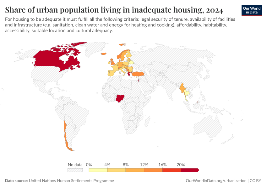 United Nations Human Settlements Programme – processed by Our World in Data. “Share of urban population living in inadequate housing” [dataset]. United Nations Human Settlements Programme, “Data from multiple sources” [original data]. Retrieved April 14, 2026 from https://data-childlabor-ilounicef.owid.pages.dev:8789/20260304-094028/grapher/share-of-urban-population-living-in-inadequate-housing.html (archived on March 4, 2026).Download