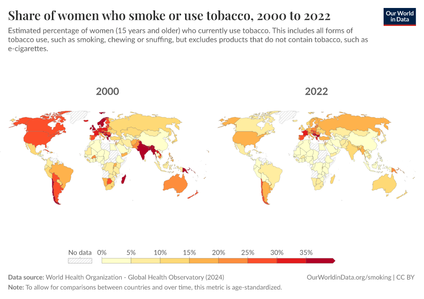 “Data Page: Share of women who smoke or use tobacco”, part of the following publication: Hannah Ritchie and Max Roser (2023) - “Smoking”. Data adapted from World Health Organization. Retrieved from https://data-childlabor-ilounicef.owid.pages.dev:8789/20260402-164039/grapher/share-of-women-who-are-smoking.html [online resource] (archived on April 2, 2026).How to cite this data