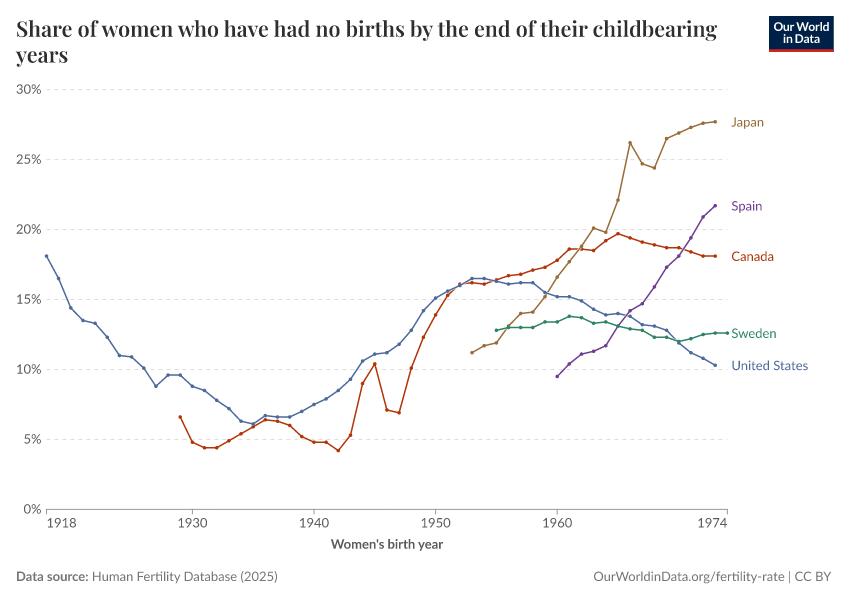 “Data Page: Share of women who have had no births by the end of their childbearing years”, part of the following publication: Saloni Dattani, Lucas Rodés-Guirao, and Max Roser (2025) - “Fertility Rate”. Data adapted from Human Fertility Database. Retrieved from https://data-childlabor-ilounicef.owid.pages.dev:8789/20260304-094028/grapher/share-of-women-who-have-had-no-births-across-their-childbearing-years.html [online resource] (archived on March 4, 2026).How to cite this data