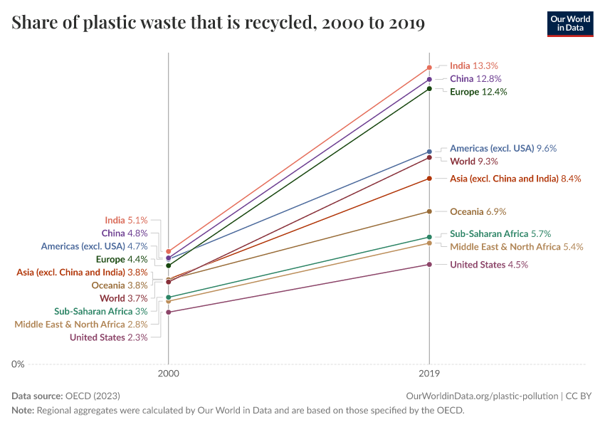OECD (2023) – processed by Our World in Data. “Share of plastic waste that is recycled” [dataset]. OECD, “Global Plastics Outlook - Plastics waste by region and end-of-life fate” [original data]. Retrieved April 14, 2026 from https://data-childlabor-ilounicef.owid.pages.dev:8789/20260304-094028/grapher/share-plastic-waste-recycled.html (archived on March 4, 2026).Download